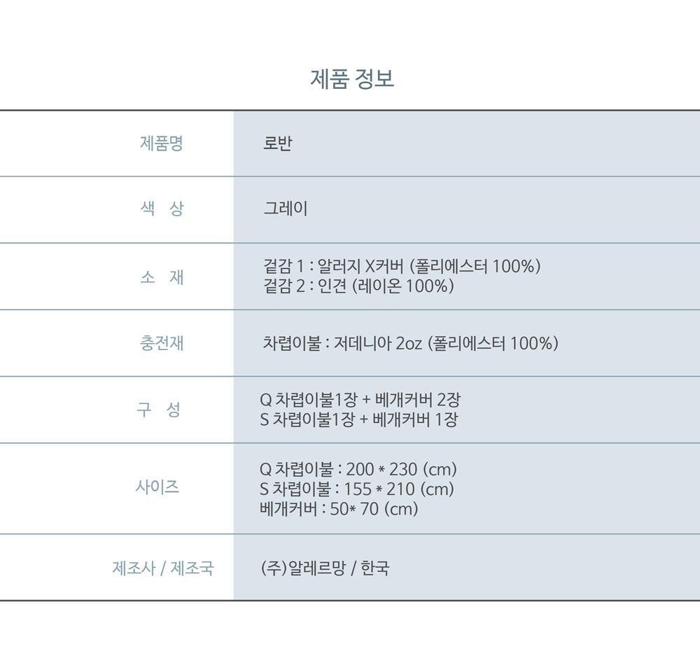 갤러리아 알레르망로반 인견차렵베개세트S(그레이)