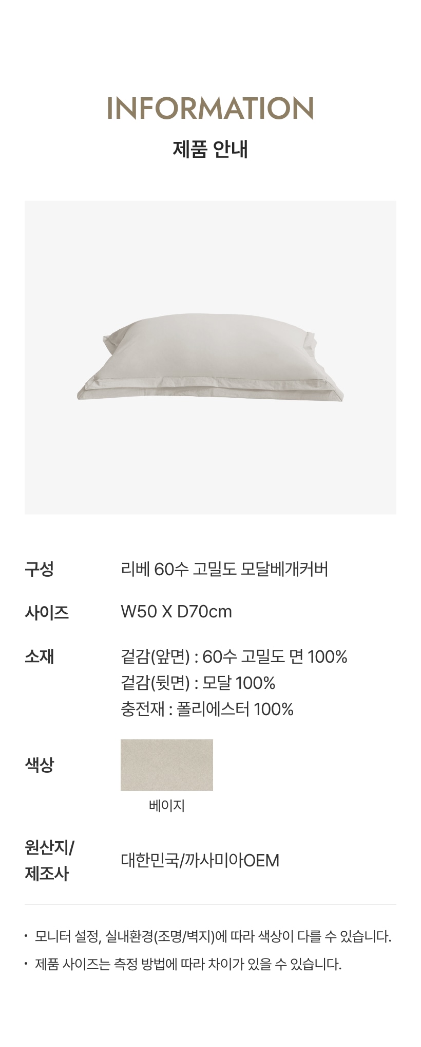 리베 60수 고밀도 모달 베개커버