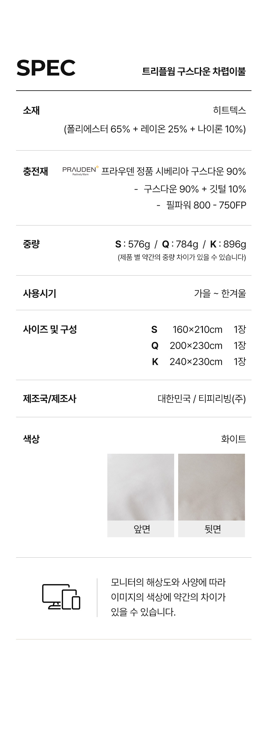 (롯데백화점)트리플웜 HEAT-TEX 시베리아 구스 차렵이불 S (사계절) 화이트