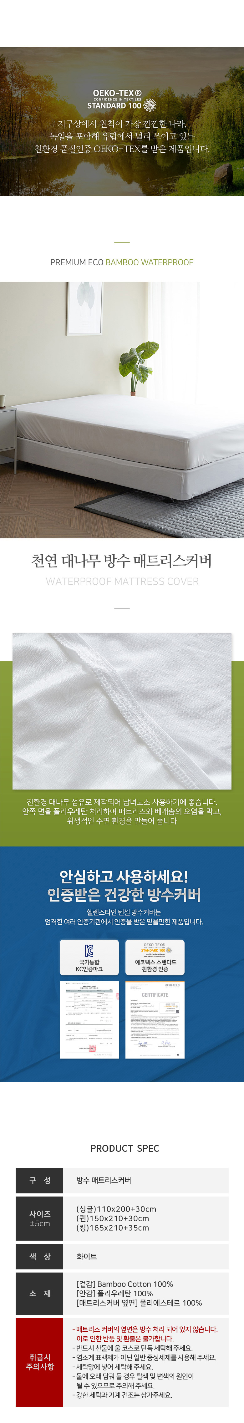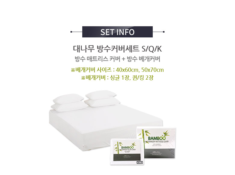 소재/재질 | [매트리스커버] : 윗면 : 100% Bamboo - 대나무원단 / 안감 : 100% 폴리우레탄 / 옆면 : 100% 폴리에스테르 [베개커버] 겉감:100% Bamboo, 안감 : 100% 폴리우레탄 |