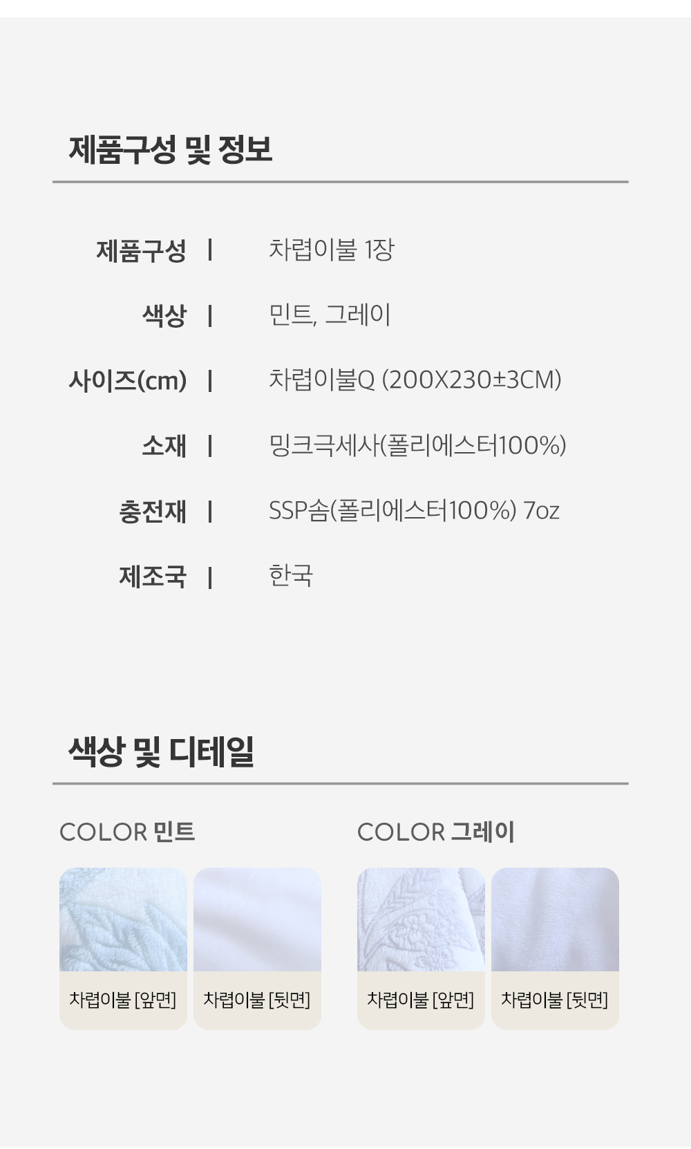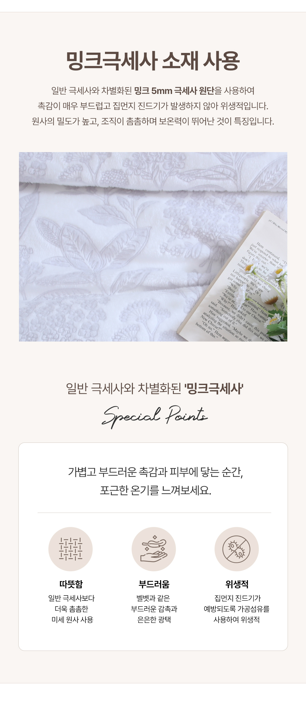 | 제품소재 | 겉감1 : 밍크 극세사 착번아웃 (폴리에스터 100%) 겉감2 : 밍크 극세사 솔리드 (폴리에스터 100%) 충전재 : SSP솜 (폴리에스터 100%, 7온스) |