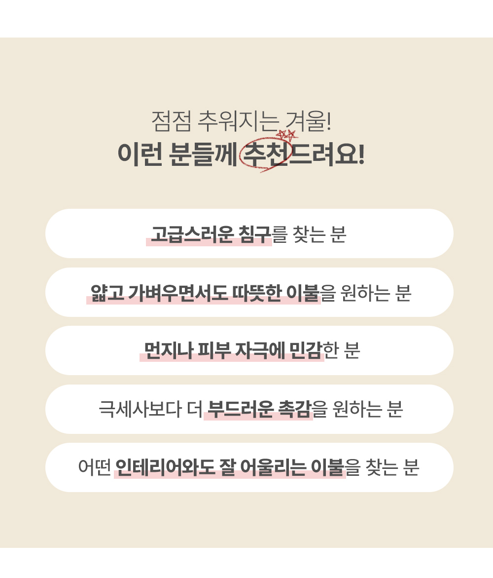 | 세탁방법 및 취급시 주의사항 | 이염의 우려가 있으니 반드시 단독 세탁 할 것. 중성세제를 사용하여 손세탁 및 울코스로 세탁할 것. 커버를 뒤집어서 세탁할 것. |