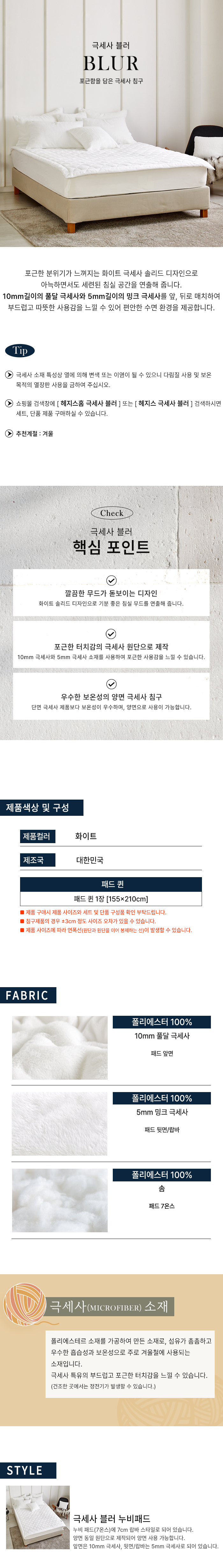 | 세탁방법 및 취급시 주의사항 | ■ 극세사원단의 특성상 정전기 발생이 있을 수 있으니 헹굼시 섬유유연제를 넣고 충분히 헹구어 주세요.\n■ 30℃ 이하의 물에서 중성세제를 사용하여 손세탁 또는 세탁기 울코스로 단독 세탁해주세요.\n■ 제품을 삶거나 표백제 사용은 피해주시고 커버류는 지퍼가 있으니 뒤집어서 지퍼를 닫은 후 세탁해주세요.\n■ 물에 오래 담구어 놓지 마시고 단시간 탈수하세요. \n (드럼세탁시 전용세제를 사용하고 열건조는 피해주세요)\n■ 건조는 뉘어서 서늘한 곳에서 하시고, 보관은 통풍이 잘되는 곳에서 해주세요. |