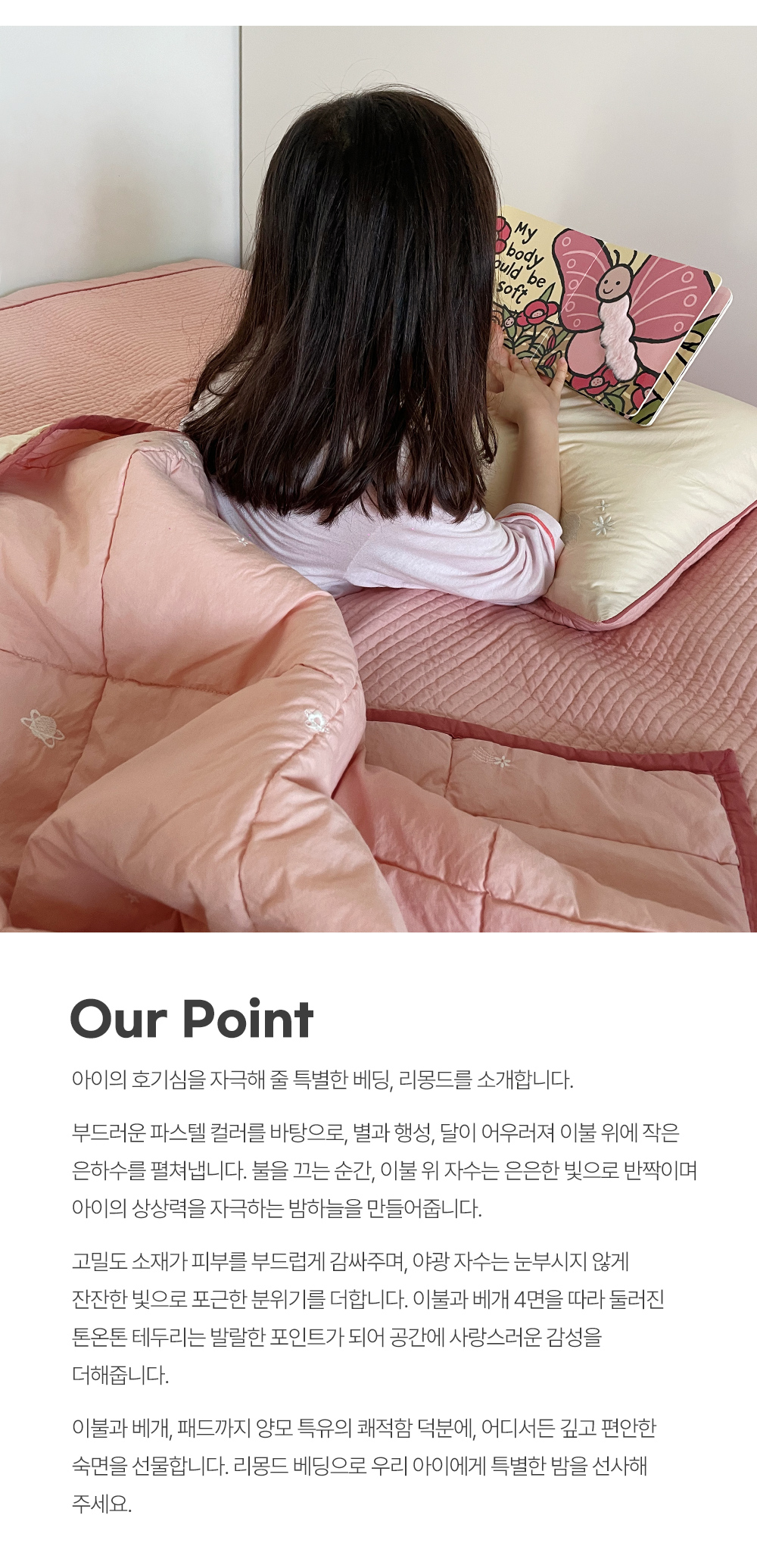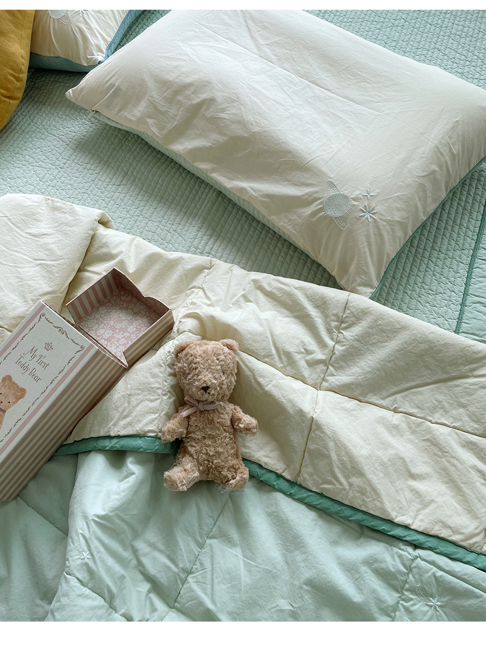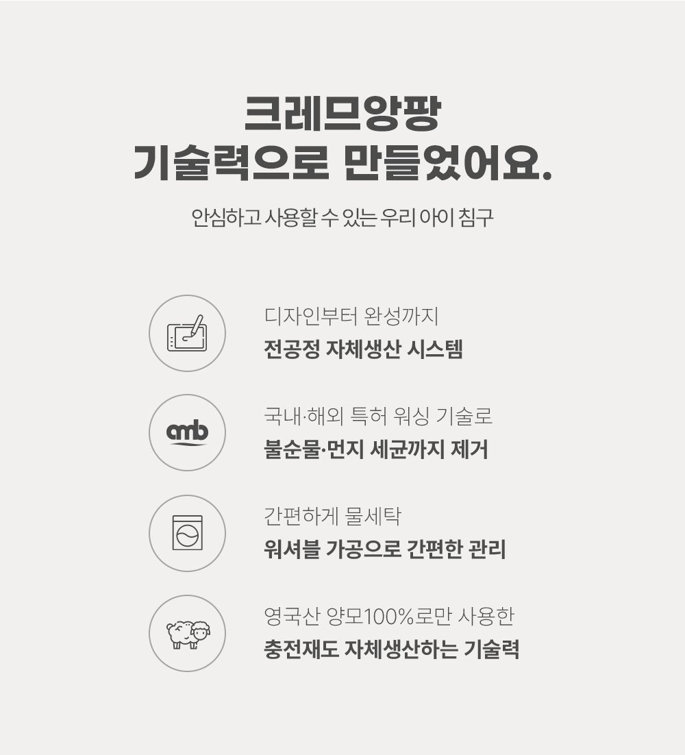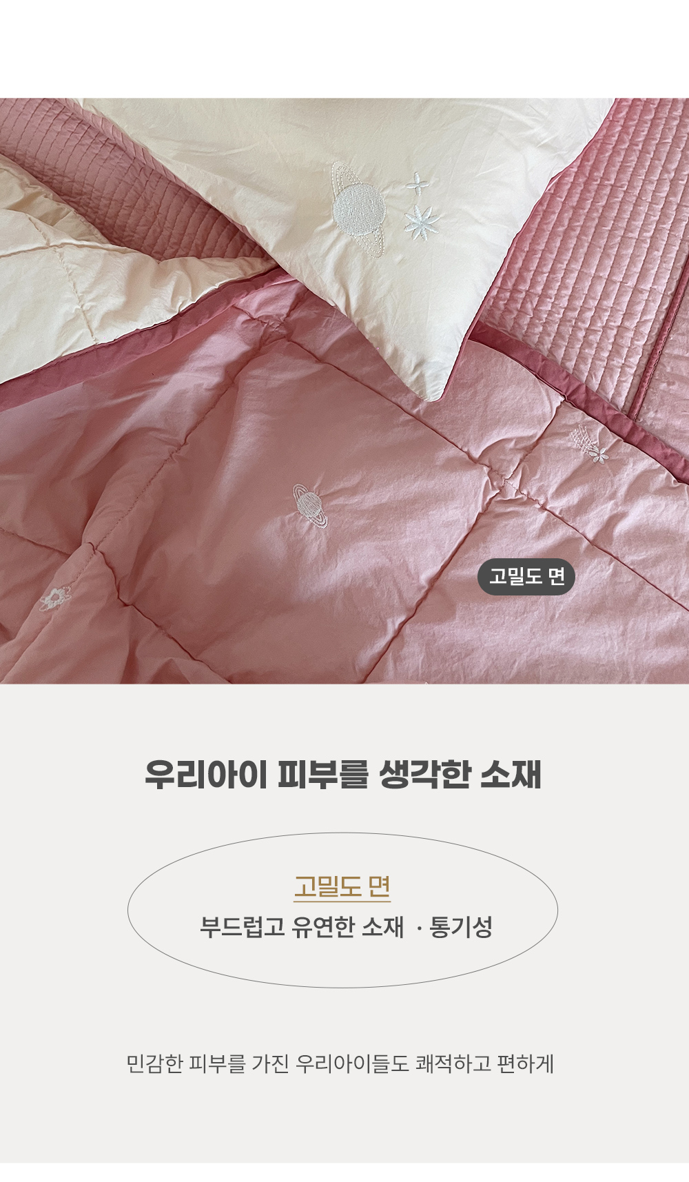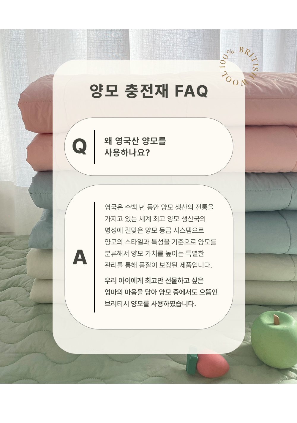 | 제품소재 | 소재 : 고밀도 면 100% 안감 : 면35%,폴리에스터65% 충전재 : 양모솜100%(amb인증) |