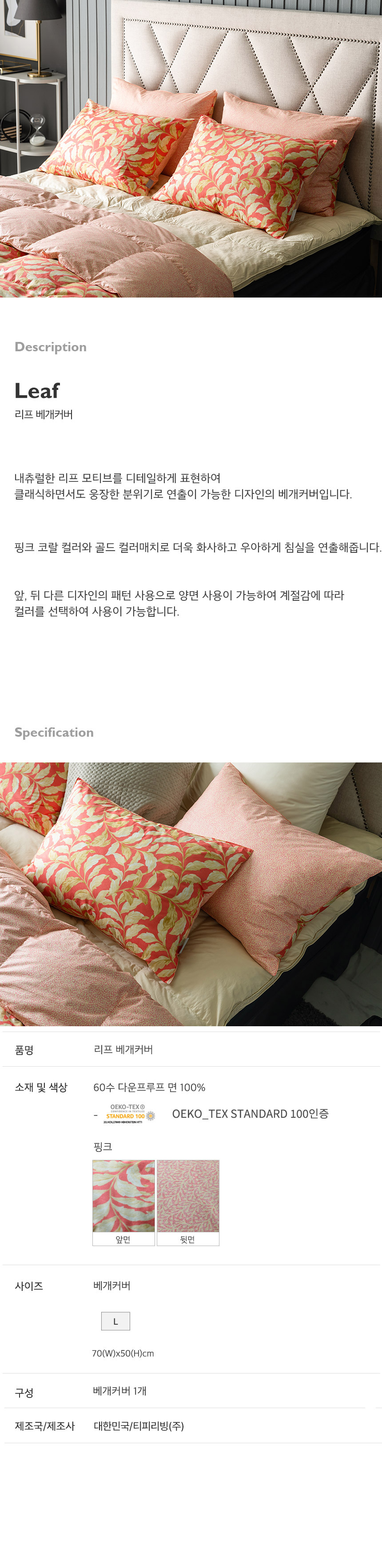 (신세계 사우스시티)리프 순면 베개커버 50X70