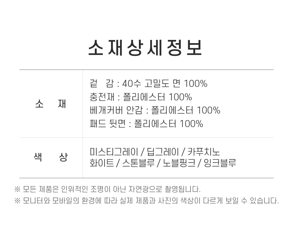 소재/재질 겉감: 순면 100% 40수 고밀도 광폭원단 / 충전재 : 폴리에스터 100%