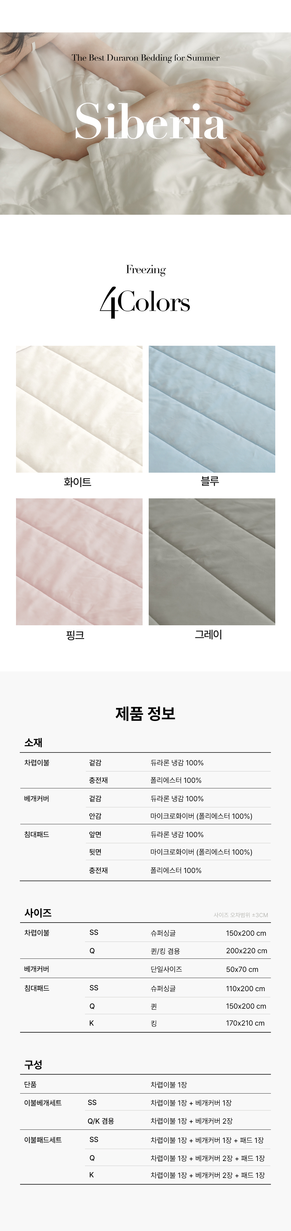 시베리아 정품 듀라론100 냉감 풀세트이불+패드+베개커버) SSQK 4color