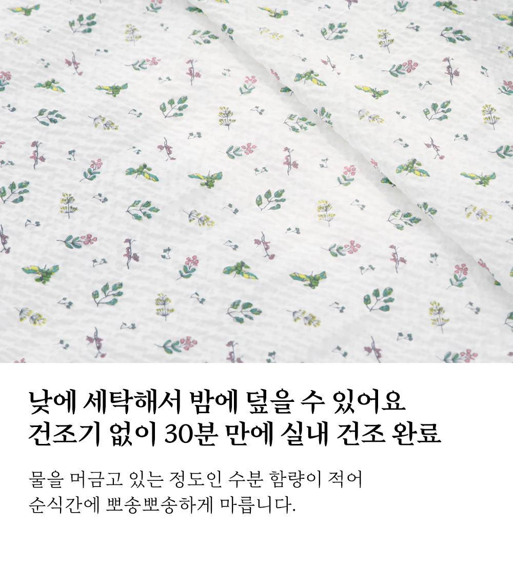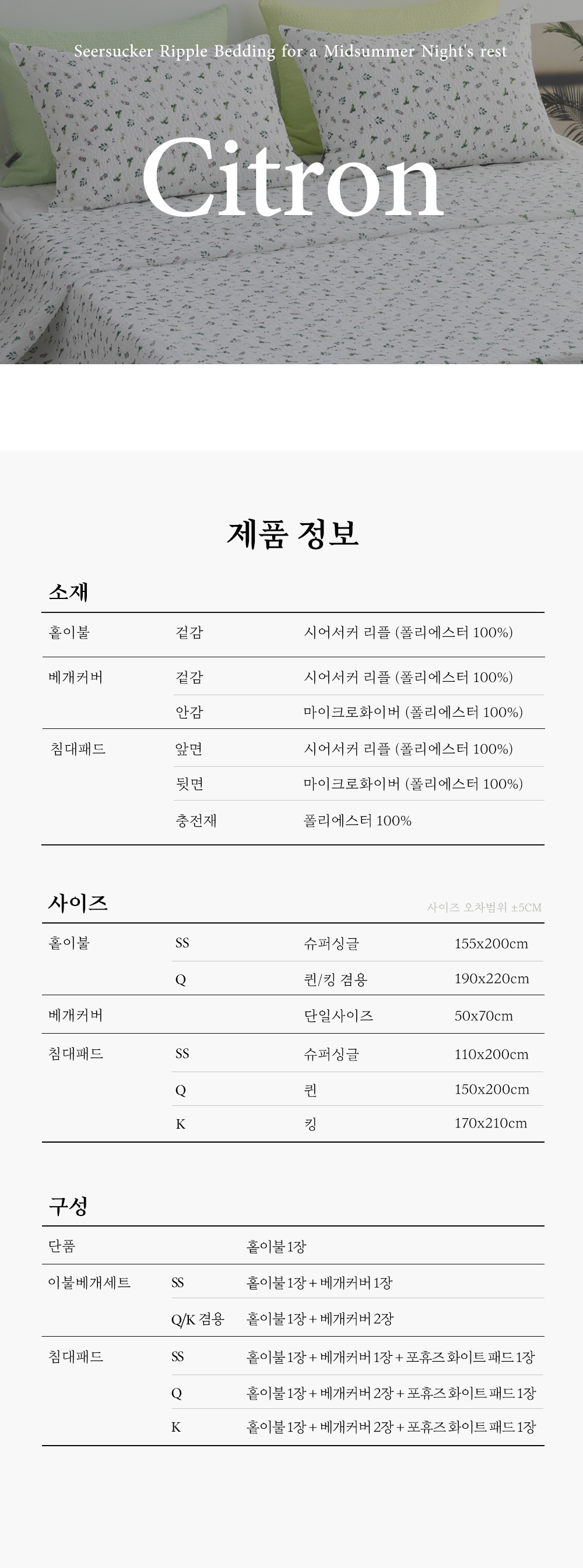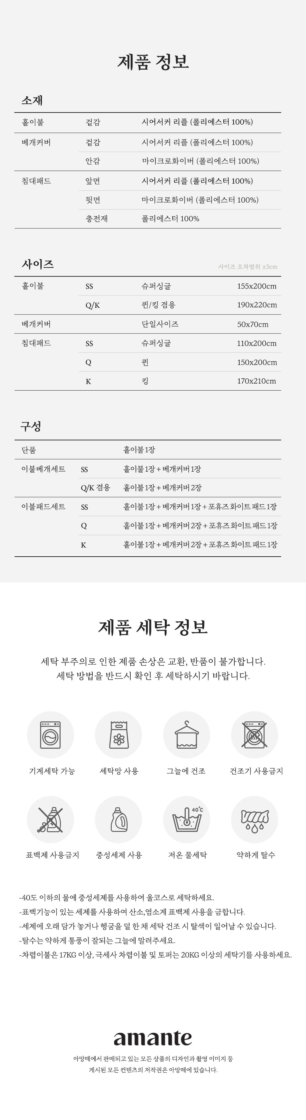 ![]() | 겉감 : 시어서커리플 (폴리에스터 100%)충전재 : 폴리에스터 100%패드뒷면 : 세미마이크로 (폴리에스터 100%)토퍼뒷면 : 미끄럼방지 원단 (폴리에스터 100%) |
