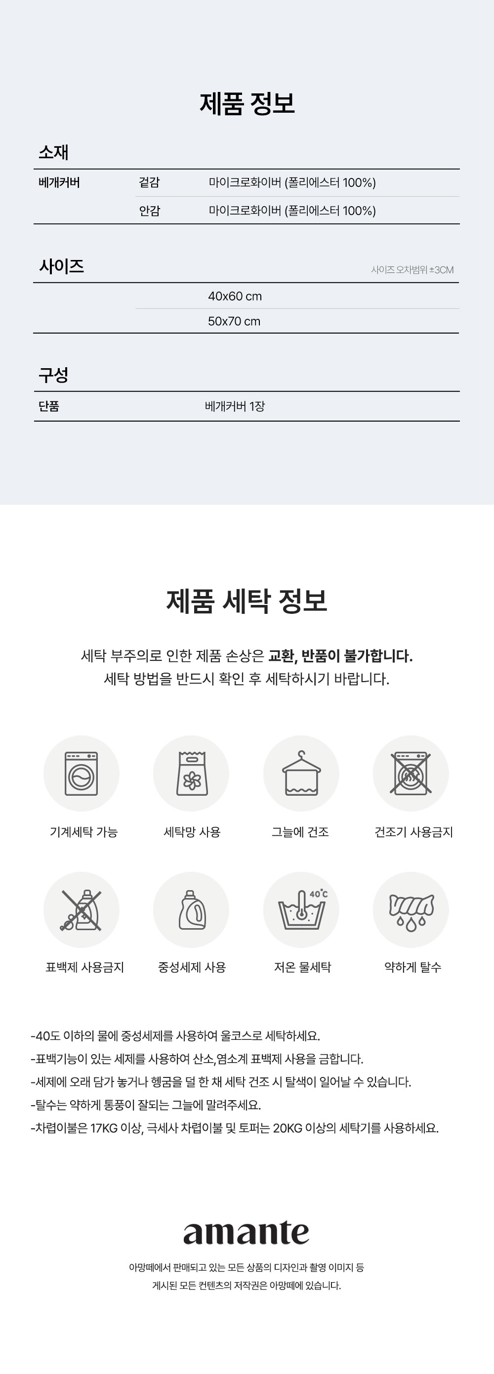 ![]() | 1. 미지근한 물에서 약하게 손세탁 또는 세탁기 울코스로 세탁하세요. 2. 중성세제를 사용하여 세탁하십시오.(염색제, 표백제 사용 금지) 3. 단독 세탁 하십시오. 4. 약하게 짜서 그늘에서 건조하십시오. 5. 삶지 마십시오. |