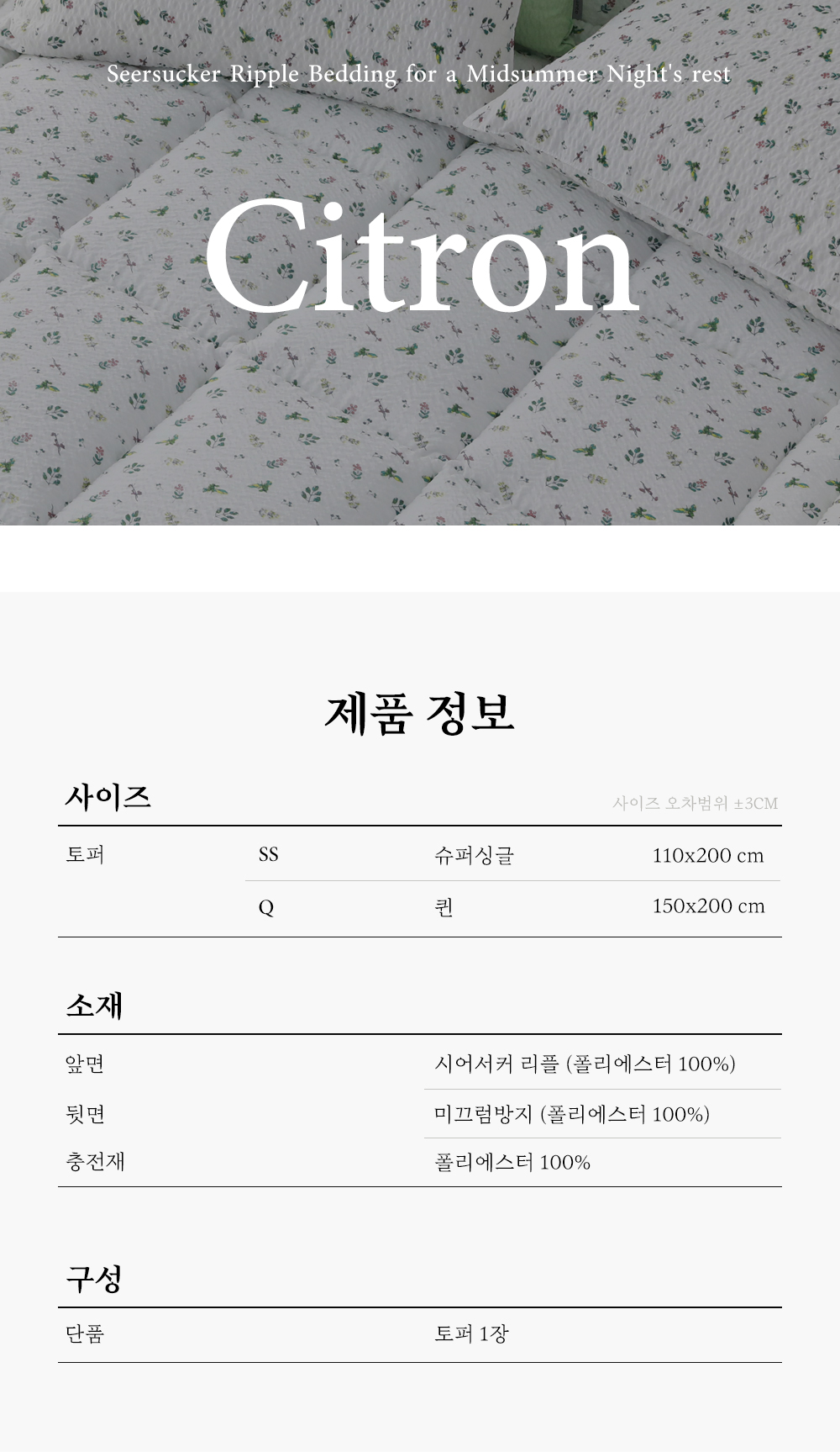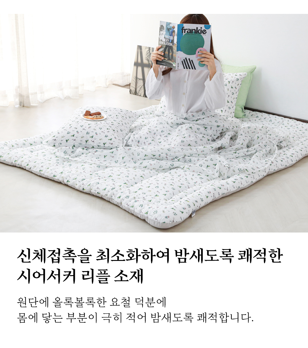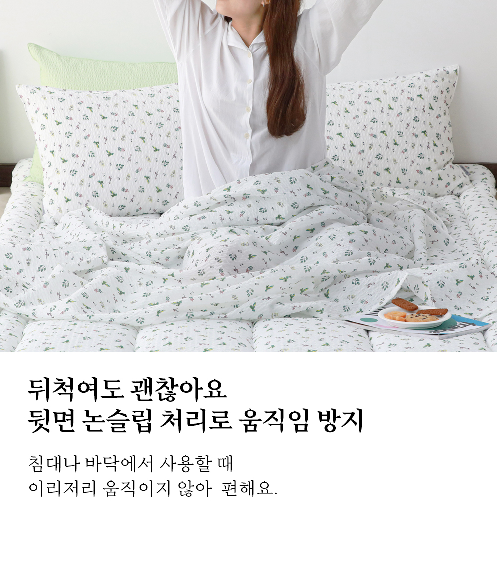 앞면 : 시어서커리플 (폴리에스터 100%)뒷면 : 미끄럼방지 원단 (폴리에스터 100%)충전재 : 폴리에스터 100% |
