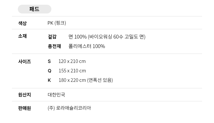 썸머펠리스2 바이오워싱 60수 고밀도 면 패드 Q35200874