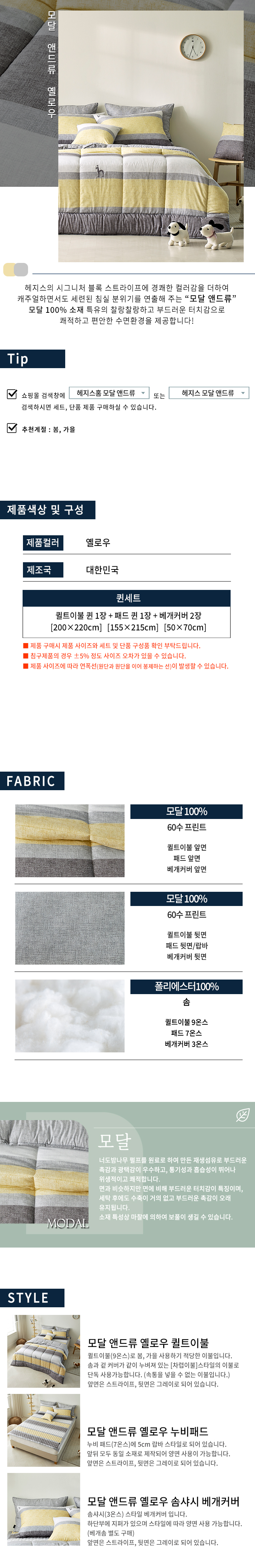 갤러리아 모달 앤드류 옐로우9온스퀸세트퀼트이불+패드+베개커버2장
