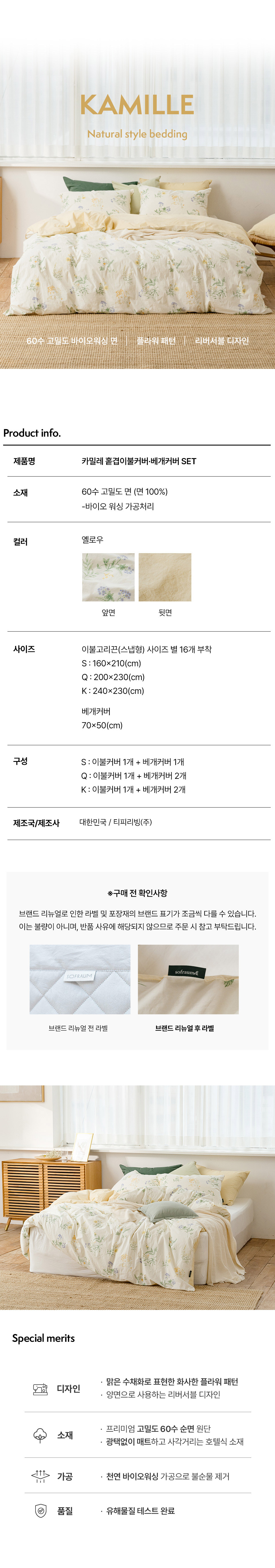 (현대Hmall)소프라움앤 카밀레 60수 고밀도 워싱 순면 이불커버 베개세트 킹(옐로우)