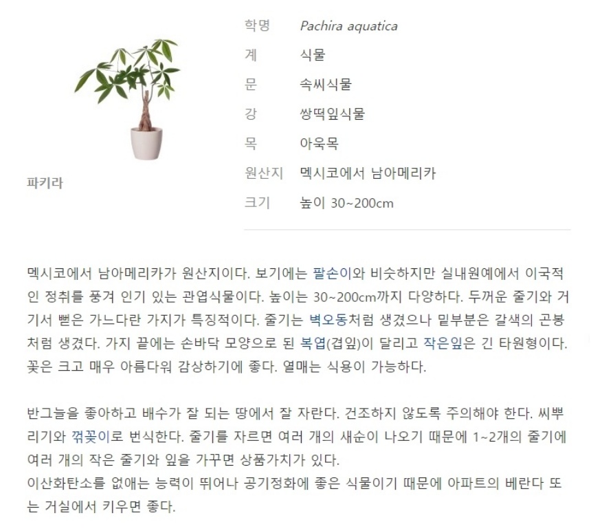 실내 공기 정화 가습 반양지 식물 파키라 모종 A